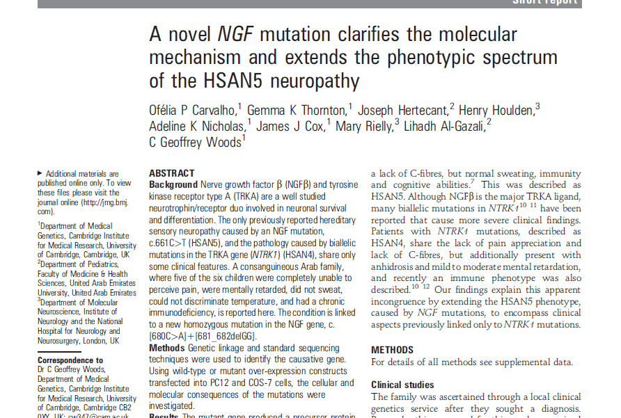 A familia com que nos deparámos tinha cinco crianças afetadas, todas com ausência de dor, incapazes de sentir a temperatura, e que não suavam. Todos tinham dificuldades na cicatrização de feridas e apresentavam ligeiro atraso mental. Encontrámos uma mutação no gene do Nerve Growth Factor (NGF), um fator de crescimento envolvido na sobrevivência celular e na regulação do sistema imunitário. No caso desta familia a mutação identificada impedia a correta secreção da proteína codificada por este gene para o espaço extracelular, onde habitualmente atua.